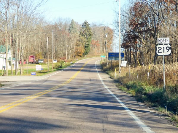 … on US federal highway 219. Lawn signs on the left-hand side of the road were supporting Donald Trump and Mike Pence as candidates for the US presidency and vice-presidency respectively, while the large blue-and-orange sign on the right welcomed me to Pennsylvania. |