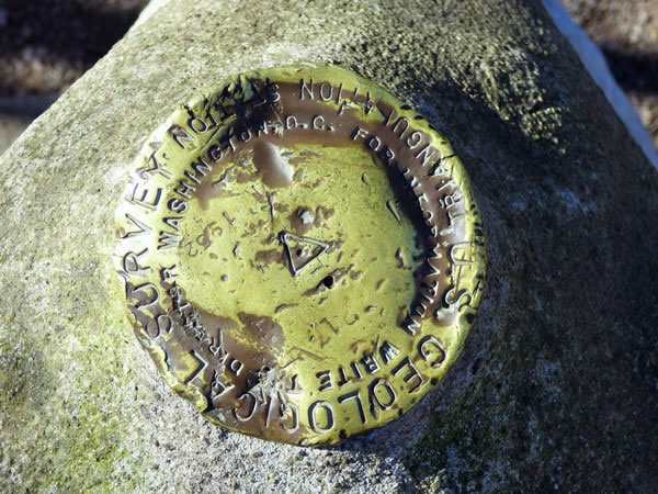 The USGS (United States Geological Survey) marker on the summit of Mt Davis, which is 3,213 feet / 979 metres above sea-level. Mt Davis is the 33rd highest of the fifty US state highpoints.