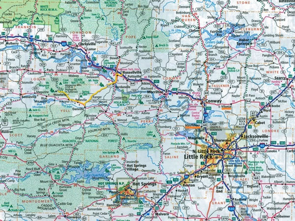 To get from Russellville to Mt Magazine, I drove south on Arkansas state route 7; south-west on Arkansas state route 27 as far as Danville; west on Arkansas state route 10 to Havana; and then north-west on Arkansas state route 309. The route that I took is marked in yellow on this map. |