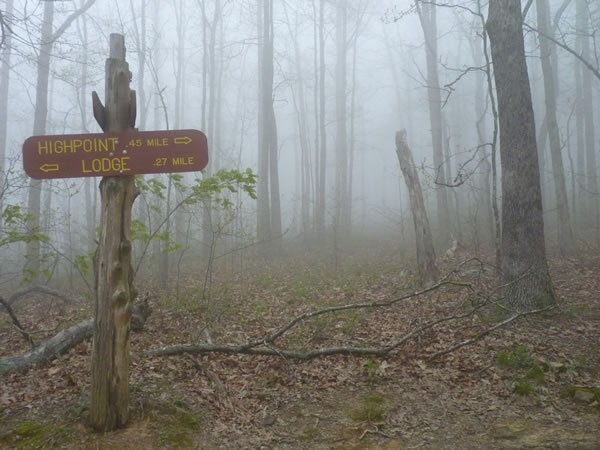 This signpost is at an intersection at the southern-most point of the clockwise loop trail I was hiking along in order to reach the Arkansas state highpoint. I had slightly less than half a mile (0.8 kilometres) to go to get to the highpoint. |