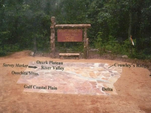 This picture on a notice board near the summit of Mt Magazine shows the position of some of Arkansas’s geographical features. Signal Hill and Mt Magazine are represented by …