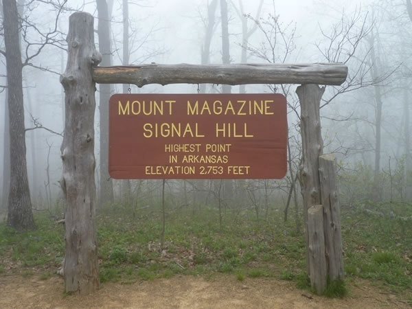 , slightly less misty) view of the sign on Signal Hill, the top of Mt Magazine – the highpoint of Arkansas.
