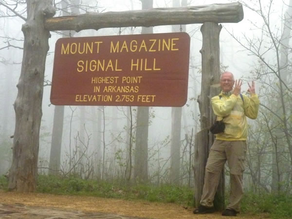 Using my head to represent twenty, this photograph I took of myself at the summit of Mt Magazine is an attempt to show that Signal Hill was the 26th US state highpoint that I’d either climbed or visited.