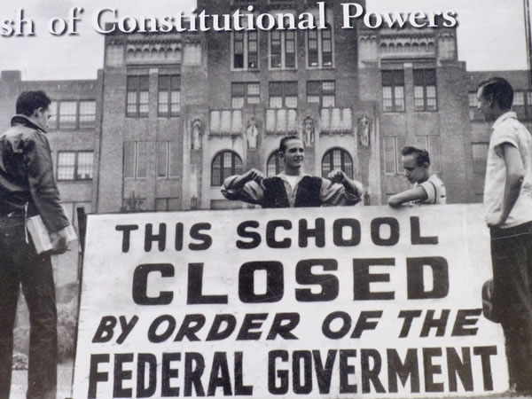 In 1957 nine African-American students tried to enrol in the previously all-white Little Rock Central High School. The Governor of Arkansas used the Arkansas National Guard to prevent the black students from enrolling, but President Dwight D. Eisenhower sent in federal troops to ensure the students could attend the school. The clash of constitutional powers in Little Rock was a key event in the long-running post-World War II struggle for civil rights in the south of the United States. |