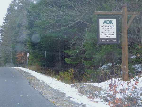 … I drove south along Adirondack Loj Road for about five miles / eight kilometres in order to reach the Adirondack Loj. As can be seen from this picture, it started snowing again while I was driving down Adirondack Loj Road. |