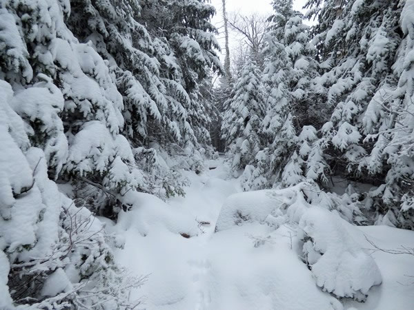 For the vast bulk of the time I was going up the mountain, I wasn’t troubled by ice on the trail – it was submerged under a blanket of thick snow. However, the snow also meant my progress up the mountain was somewhat slower than I’d have liked. |
