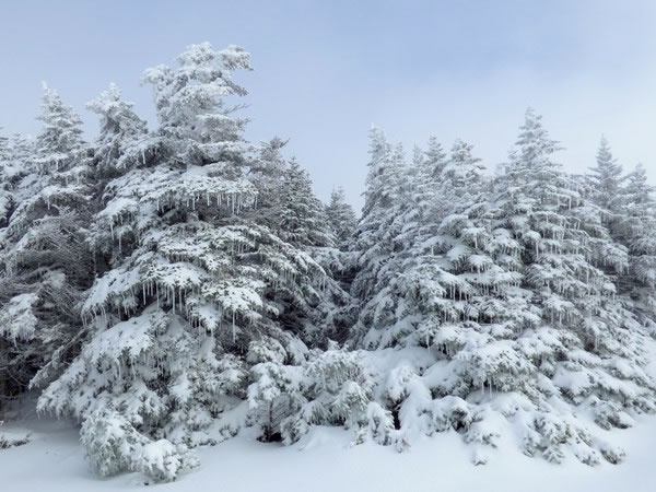 After leaving the Hopkins and Van Hoevenberg trail-junction, the snow was even thicker. The icicles hanging from these conifers looked like upside-down candles on a collection of Christmas trees.