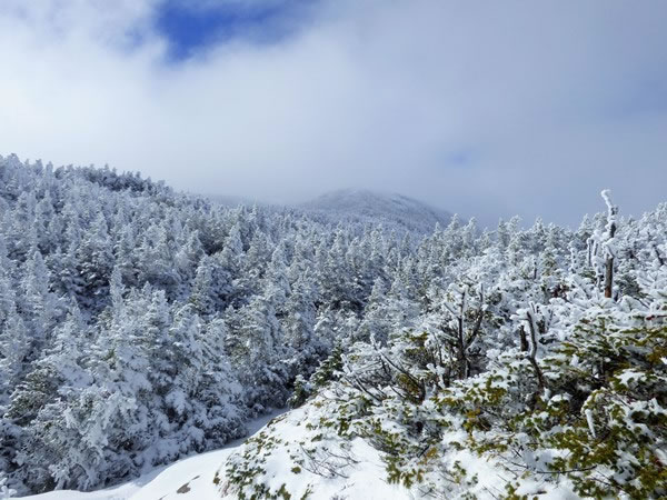 At 12:38 pm, I caught a glimpse of the upper slopes of Mt Marcy for the first time. Sadly, it also proved to be the last time.