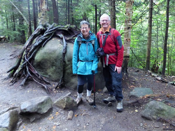 We reached the turn-off to Phelps Mountain – where a tree has wrapped its roots around a large boulder in a very distinctive manner – at 8:12 am, and we again asked a passing hiker to take our photograph. After slightly less than two hours on the trail, we are both looking very happy. |