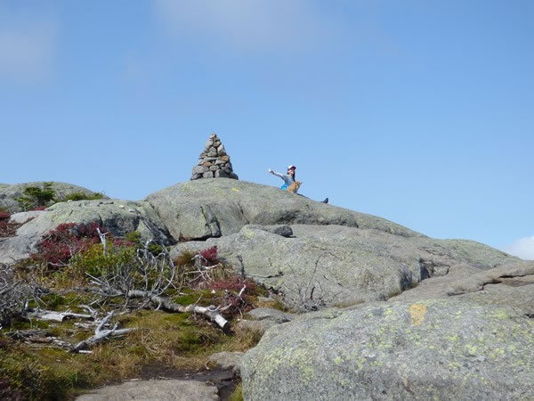 In addition to yellow blazes on the rocks, cairns are also used to show the way. The woman with the small dog was resting alongside the first cairn when I caught up with her.