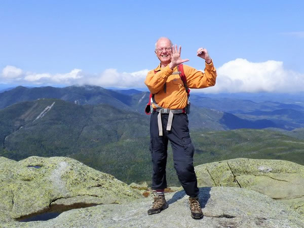 I reached the summit of Mt Marcy at 12 noon on Sunday, 10 September 2017 (a mere seventeen minutes after leaving Heather). In this photograph I’m indicating that it was the 50th US state highpoint I’d climbed, hiked up, or visited. |
