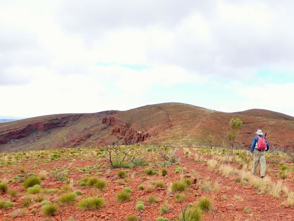 At 10:42 am, Eric took this photograph of me on the track that leads to the summit of Mt Meharry, which is the highest point on the skyline. It took us only ten minutes to hike from here to the summit.