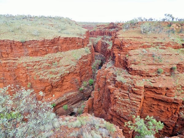 We spent Saturday, 9 July 2016, seeing some of the gorges in the main section of the Karijini National Park. This photograph was taken above Junction Pool, and looks down onto the spot where four gorges – the Hancock, Joffre, Red, and Weano gorges – meet. |