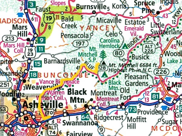 The route from my motel to Mt Mitchell was straightforward. I drove west on US federal highway 70 for a short distance before turning onto the Blue Ridge Parkway. I then headed north and north-east on it for 27 miles / 43 kilometres, at which point I turned left onto North Carolina state highway 128 and drove up it for a few miles until I reached the Mt Mitchell State Park office and information centre. |