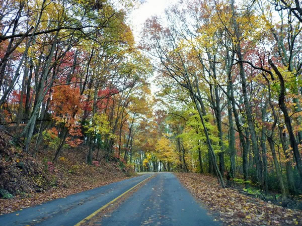 I took this photo of the wide range of autumn colours – from light green through yellow to dark red – in the leaves on the trees alongside the Blue Ridge Parkway as I headed north-east towards Mt Mitchell.