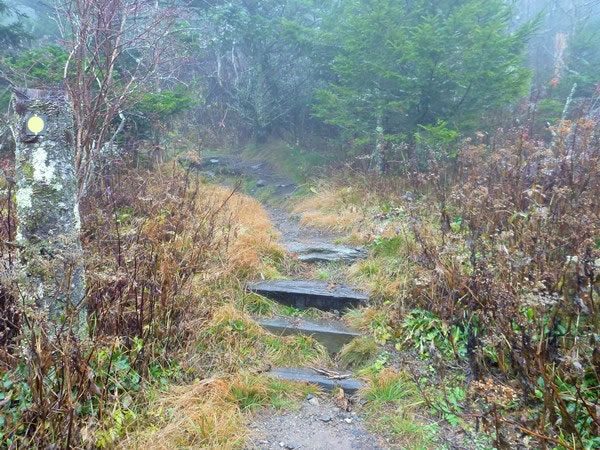 A yellow blaze on a tree stump near the start of the Old Mitchell Trail.