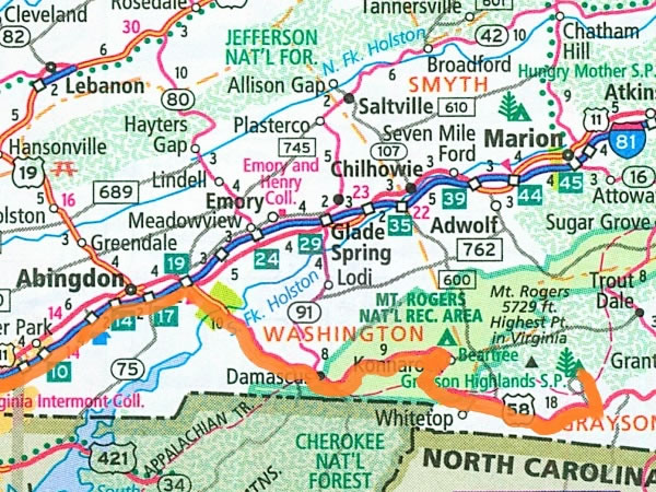 The route I took to get to Mt Rogers is marked with an orange line on this map. I left US-81 at exit 19 and headed east on US federal highway 58 as far as Damascus, Virginia, where I checked into an hotel. The following morning I continued driving east on US-58 until I turned left and headed north on Virginia state highway 362 into the Grayson Highlands State Park. |