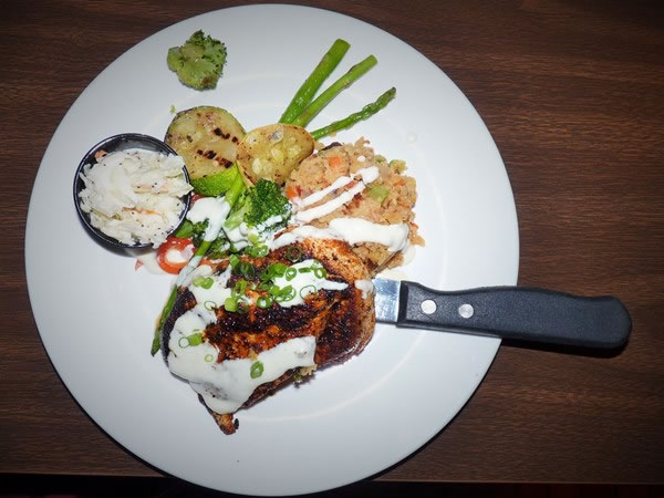 Given that I intended to climb Mt Rogers the next day, I couldn’t resist having “Mt Rogers Blackened” for dinner. It consisted of Cajun seared chicken-breast, asparagus, broccoli, coleslaw, zucchini, and cornbread stuffing: it was delicious.