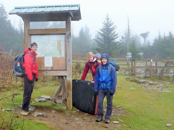 At 10.15 am, I met four young men who were from Richmond, Virginia, and had been on a weekend bouldering trip (which is why the man second from the right is holding a large bouldering mat or “crash pad”). The day’s wet weather had rendered the rocks on the mountain unsuitable for climbing, so this foursome was also heading back to their cars. |