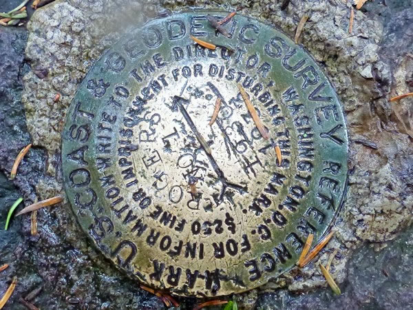 A second rock at the summit of Mt Rogers also has a geodetic survey marker on it, and – according to an article in issue 110 of Apex to Zenith, the Highpointers Club magazine – it is this second rock, with a marker with an arrow on it, that’s the true highpoint of Virginia. |