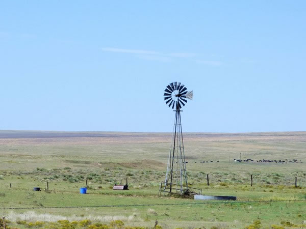 A windmill and water-trough for the cattle seen in the background on a ranch alongside the gravel road that runs parallel with the Colorado – Kansas state line.