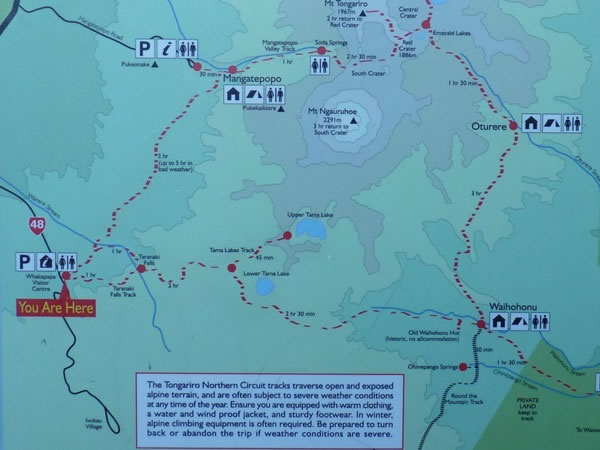 The Northern Circuit track starts only a few metres from the Skotel resort. This map at the beginning of the track shows where we went. Our first day’s walk was from Whakapapa to the Mangatepopo hut. On our second day we followed the Tongariro Crossing track as far as the Emerald Lakes before branching right (i.e., south-east) in order to go to the Oturere hut. Day three was from Oturere to the Waihohonu hut, and on our fourth and final day on the Northern Circuit we headed west, back to Whakapapa. |