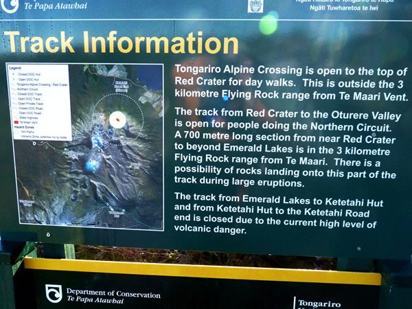 This warning was prominently displayed alongside the Northern Circuit map at the start of the track. Although volcanic eruptions on Mt Tongariro during 2012 meant that the second half of the Tongariro Crossing (namely, the portion of the track from the top of the Red Crater to Ketetahi) was closed, hikers doing the Northern Circuit could head on down into the Oturere valley, but in doing so they would – for a while – be within “Flying Rock range” of the volcanic vent. |