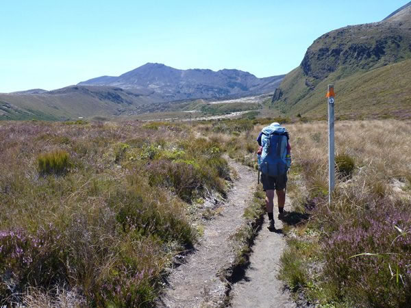 At 12:06 pm, almost three hours after leaving Whakapapa Village, we got our first view of the Mangatepopo hut: the roof is a tiny white line about one-fifth the way in from the left-hand edge of the photo and a little above the height of Heather’s head. Mt Tongariro (1,968 metres / 6,456 feet) dominates the distant skyline. |