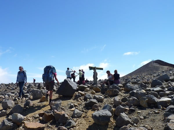 Heather arriving at the spot where a track to the summit of Mt Tongariro heads off to the left. On this occasion, Heather and I didn’t veer off and climb Tongariro (I’d climbed it in 1990 with Kurt Wetzel and Evan Roberts). Instead, we continued making our way towards the highest point of our walk – to the top of the Red Crater, which can be seen on the right-hand skyline. |