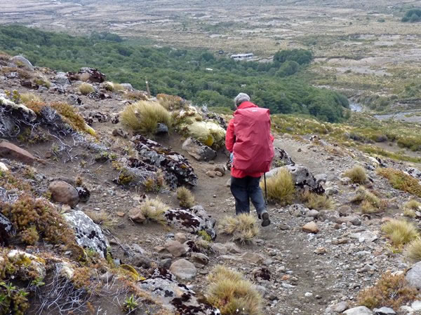 At 11:35 am – two hours and fifty minutes after leaving the Oturere hut – we got our first glimpse of the Waihohonu hut, which can be seen in the distance above Heather’s head.