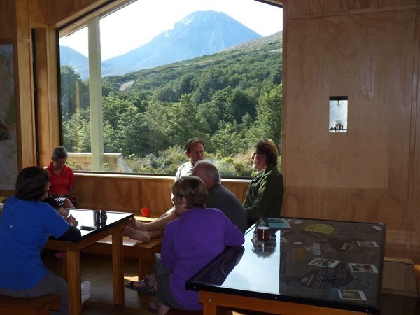Heather and the five New South Wales hikers sitting in front of one of the Waihohonu hut’s large picture windows that has a good view of Mt Ngauruhoe.