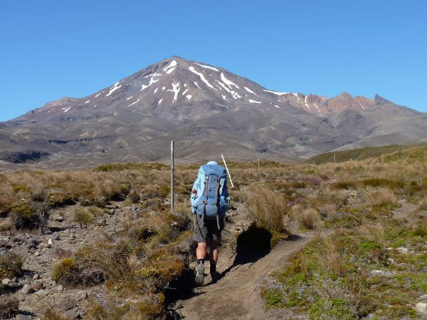 With Mt Ruapehu dominating the southern skyline, Heather heads along the Waihohonu track portion of the Tongariro National Park’s Northern Circuit.