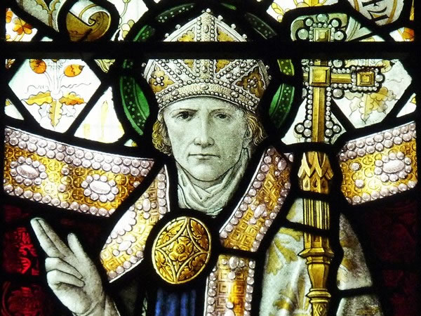 Introduction: St David, the patron saint of Wales. (This photograph of a stained glass representation of St David was taken in the cathedral in St David’s, a small city – with a population of only 1,600 or so – in western Wales; indeed, St David’s is the smallest city in Britain.) |