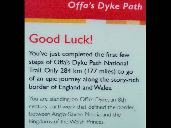 … wishing walkers good luck. On the other side of the bridge, there’s a notice congratulating hikers for finishing their Offa’s Dyke Path walk. Beneath the “Good Luck!” notice …