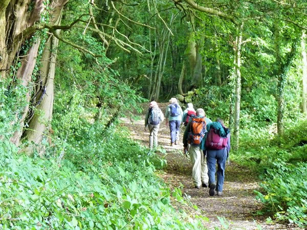 Walking though woods high above the River Wye are (from right to left) Peggy, Bob, and Heather, and two women from the United States, Beth and Nancy, who had also set out from Chepstow earlier in the morning to walk the full length of the Offa’s Dyke Path. |