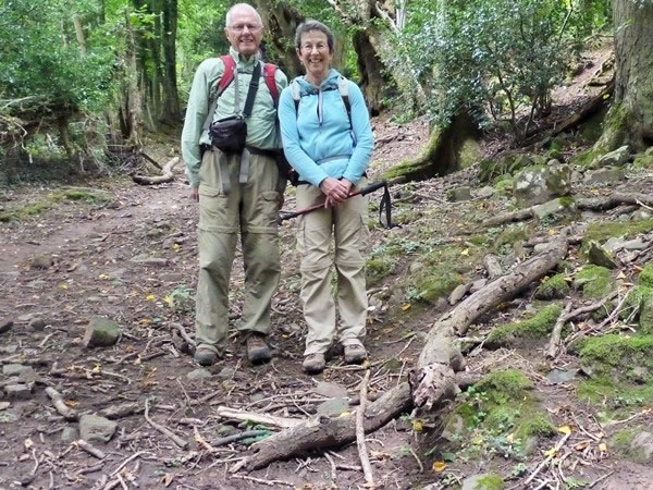 A picture of Heather and me in the Highbury Woods, standing beside part of Offa’s Dyke. It was, in fact, the last we’d see of the dyke until after leaving Kington on Day 6 of our walk. |