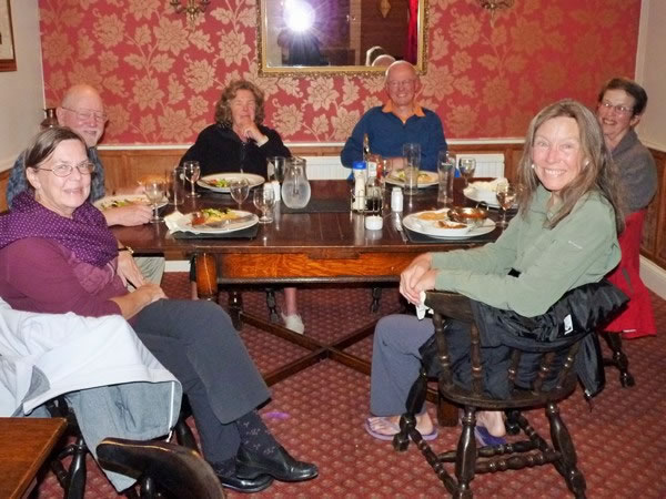 After a shower and a glass of port at Inglewood, we had dinner in one of the pubs in Lower Redbrook, and were joined by the American women we’d met earlier in the day near the Devil’s Pulpit. From left to right are Peggy, Bob, Beth (from Philadelphia), self, Nancy (from Shenandoah), and Heather. |