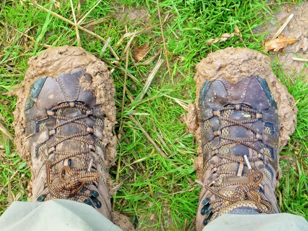… our boots were caked thick with sticky mud.