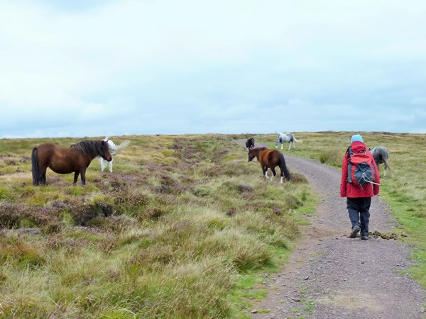 Heather walking past some of many horses and ponies that we saw on the Black Mountains.