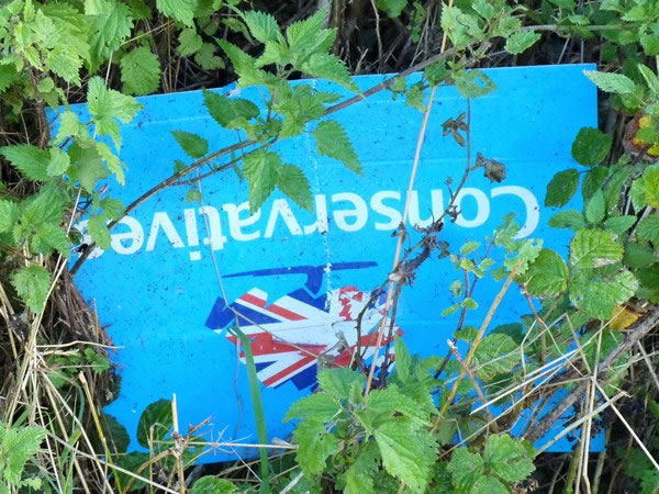 Upside down and abandoned in a hedge-row: a Conservative Party poster from the 7 May 2015 general election.