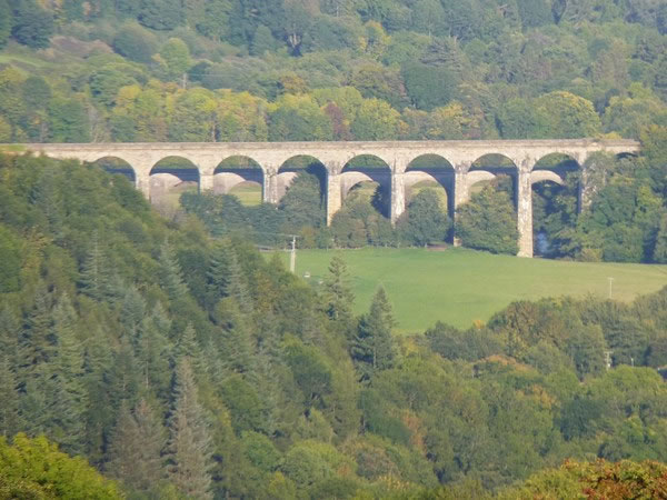 Looking down into the valley below us, I took this telephoto picture of two impressive engineering feats: Henry Robertson’s railway bridge, which is the taller of the two structures, and – behind the bridge – Thomas Telford’s aqueduct that carries the Llangollen Canal over the River Ceiriog.