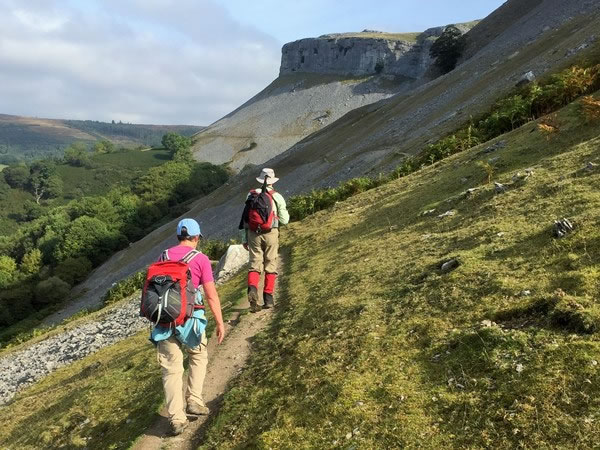 Bob took this picture of Heather and me approaching the scree slopes beneath Eglwyseg Mountain.