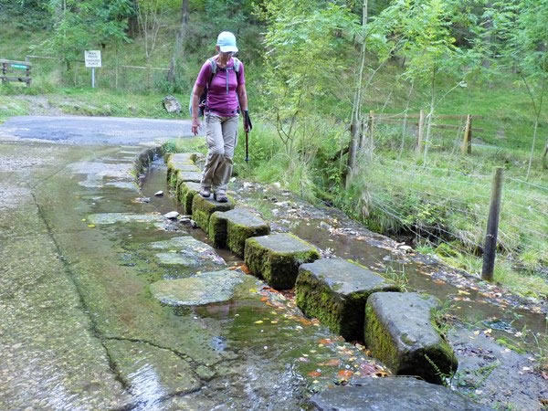 Heather keeping her feet dry by using stepping-stones to cross a ford near World’s End.