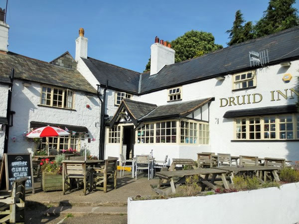 … our destination, the Druid Inn (which is on the outskirts of a town called Llanferres). (Peggy took this photograph of the inn after she’d got a ride here, accompanying our luggage from Llangollen.)