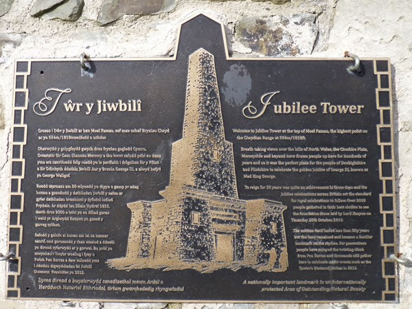 As this sign explains, the Jubilee Tower sits on the summit of Moel Famau, 1,818 feet / 554 metres, the highest peak in the Clwydian Range. The tower was built to commemorate the 50th anniversary of the reign of George III. Somewhat fittingly for the monarch who was known both as Mad King George and as the King who lost the American colonies, the tower collapsed in a gale in 1862.