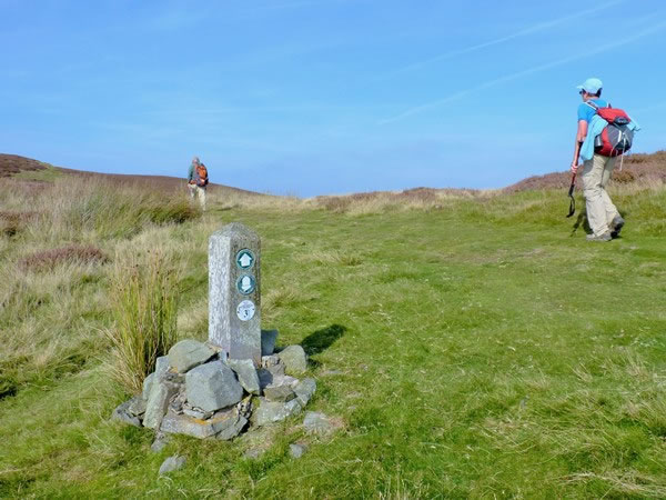 Bob and Heather walking past a way-marker on the northern Clwydian Range.