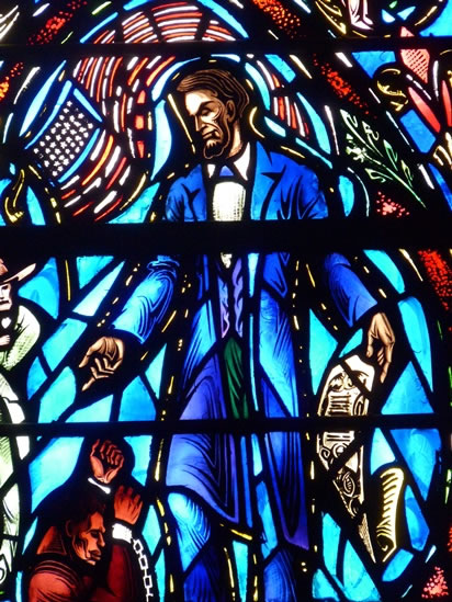 A stained glass representation of Abraham Lincoln holding the Emancipation Proclamation and urging a chained slave to stand up.