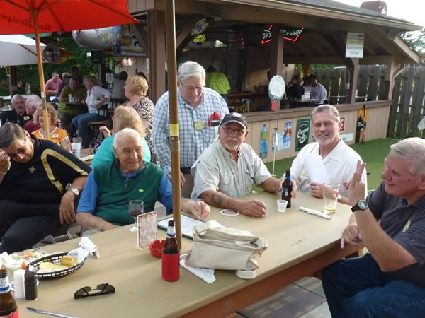 Core members of the Roosevelt High 1962 football team chat with Tom Campana (second from the left, wearing the green sweater). Now a mere 91 years old, Mr Campana was one of the team’s coaches in 1962. From left to right, the others round the table are Bill Richards, John Kordinak (standing), Bob McCracken, Richard Chernek, and Ed Taylor. |