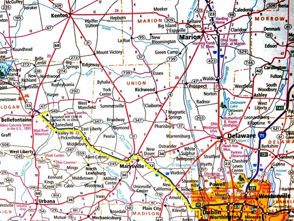 On Monday morning, 19 August 2013, I drove on US highway 33 from Columbus almost as far as Bellefontaine. I then turned right, i.e., east, onto Ohio state highway 540 and after less than a mile turned right again to reach Campbell Hill, the highest point in Ohio. The route I took is marked in yellow on this map. |