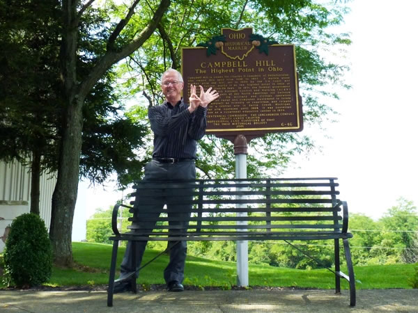 I got to the top of Campbell Hill at 12:40 pm on Monday, 19 August 2013. It’s 1,550 feet / 472 metres above sea-level, and is the 43rd highest of the US state highpoints. With my head representing the number 10, I’m trying to signal the fact Campbell Hill was the 17th US state highpoint that I’d climbed / visited. |